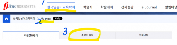 잼스(JAMS) 로그인 → 상단 메뉴의 <한국일본어교육학회> → <My page> 클릭 → <증명서 출력> 클릭 → <게재예정증명서 목록> → 출력 <프린트> 클릭 → 증명서 새창이 열리면 <프린트> 클릭. 완료